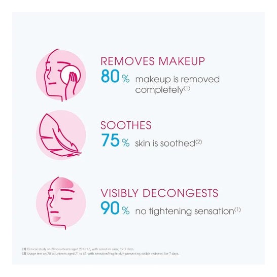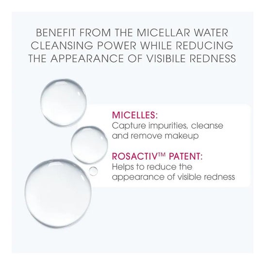 Hypoallergénique, elle permet un démaquillage et un nettoyage profond du visage et des yeux en un seul geste, éliminant impuretés, traces de maquillage ou résidus de pollution. Sa formulation brevetée Rosactiv™ agit comme un soin pour les peaux soumises à la vasodilatation, en diminuant et prévenant l'apparition de rougeurs. En complément, l'extrait de concombre apaise immédiatement.