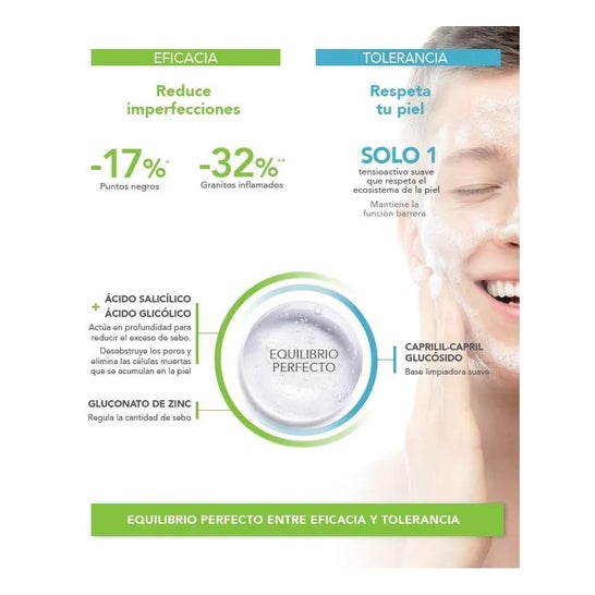 Grâce à sa formulation et ses ingrédients actifs, ce gel moussant permet de réguler durablement la production en excès de sébum, de désobstruer les pores, de réduire les brillances (zone T du visage) et de diminuer les imperfections, tout en respectant l'équilibre cutané.