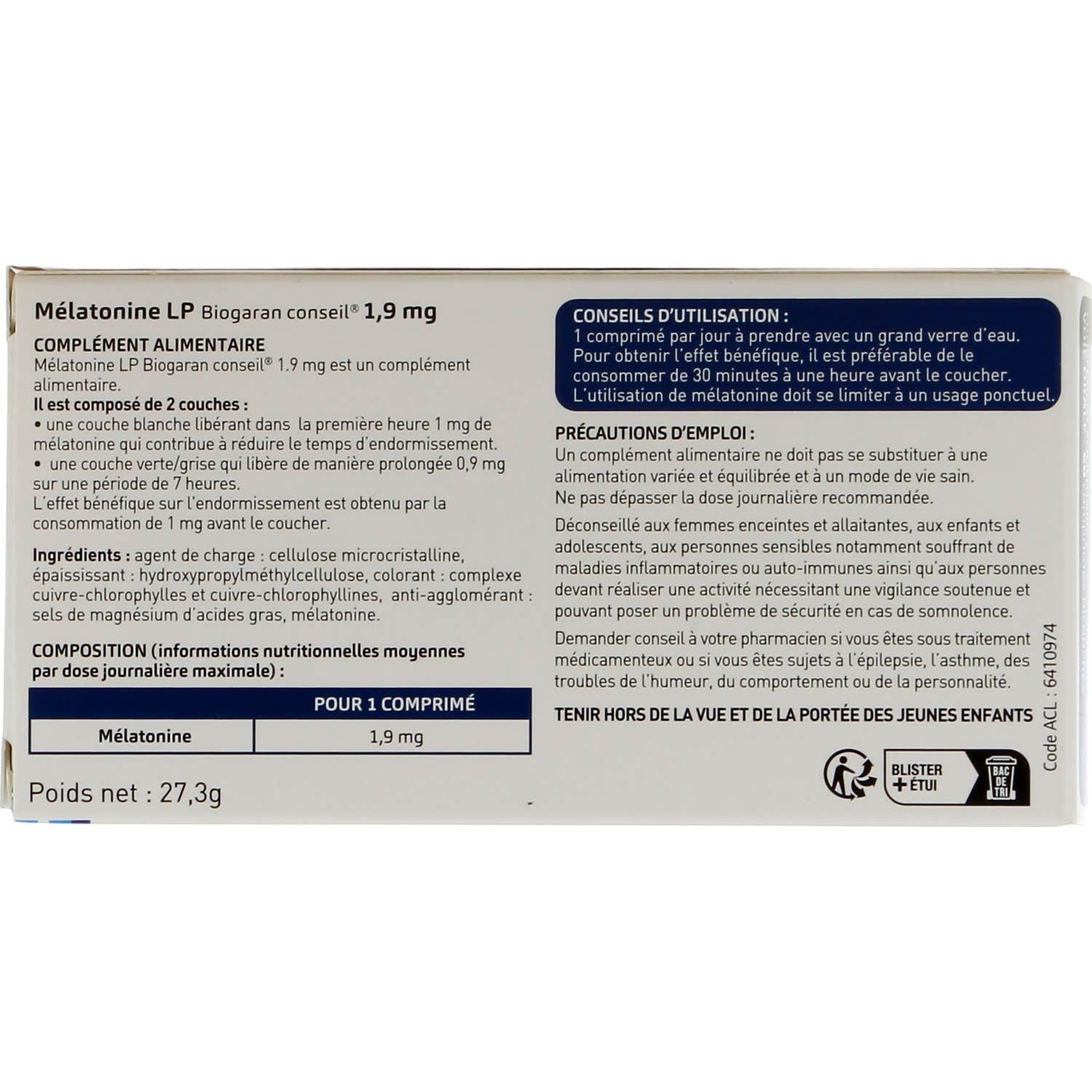 Biogaran Melatonine LP 1,9 mg est un complément alimentaire à double couche qui offre une libération immédiate et prolongée. Il contient de la mélatonine, un composé conçu pour réduire le temps nécessaire pour s'endormir. Ce produit ne crée pas de dépendance et offre un effet durable allant jusqu'à 8 heures, améliorant les phases de sommeil.