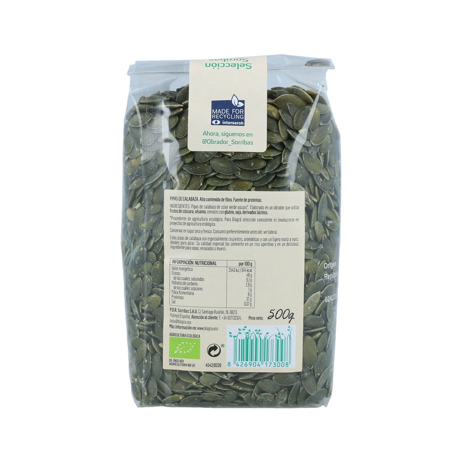 Biogra Pumpkin Seeds Pipas Bio 500g graines de courge prêtes à consommer, issues de l'agriculture biologique. elles sont une source d'acides gras sains et de protéines de haute valeur biologique. elles favorisent le processus digestif et la santé de la flore intestinale. elles contiennent des phytostérols, du magnésium, du zinc et des acides gras oméga-3, qui contribuent au maintien et à la protection de la santé cardiovasculaire. recommandées pour les céréales, les salades, le riz, les sauces et les plats préparés. produit certifié.