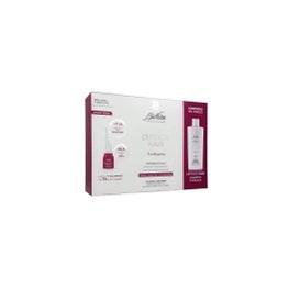 Set de traitement capillaire qui aide à renforcer les cheveux. Il comprend une lotion en ampoules et un shampooing, des produits dont la formule permet de réparer les cheveux depuis la racine, en leur apportant brillance et douceur.