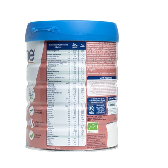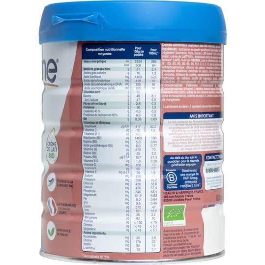 LACTOSÉRUM EN POUDRE PARTIELLEMENT DÉMINÉRALISÉ* (LAIT), HUILES VÉGÉTALES* (TOURNESOL, COLZA, COPRAH), LAIT ÉCRÉMÉ* 16%, MALTODEXTRINE DE MAÏS*, CRÈME DE LAIT, LACTOSE (LAIT), ÉPAISSISSANT : FARINE DE GRAINES DE CAROUBE 3.3%, ÉMULSIFIANT (LÉCITHINE DE SOJA), HUILE VÉGÉTALE DE MORTIERELLA ALPINA (ARA), HUILE DE DHA ISSUE DE CRYPTHECODINIUM COHNII, VITAMINES (ACÉTATE DE RÉTINOL, CHLORHYDRATE DE THIAMINE, RIBOFLAVINE, D-PANTOTHÉNATE DE CALCIUM, PALMITATE D'ASCORBYLE, CHLORHYDRATE DE PYRIDOXINE, ACIDE PTÉROYLMONOGLUTAMIQUE, CYANOCOBALAMINE, L-ASCORBATE DE SODIUM, CHOLÉCALCIFÉROL, ACÉTATE DE DL-ALPHA-TOCOPHÉROL, D-BIOTINE, PHYLLOQUINONE, NICOTINAMIDE), CARBONATE DE CALCIUM, CHLORURE DE CALCIUM, PYROPHOSPHATE DE FER, CHLORURE DE CHOLINE, HYDROXYDE DE CALCIUM, INOSITOL, L-TYROSINE, SULFATE DE ZINC, CITRATE TRIPOTASSIQUE, CHLORURE DE POTASSIUM, PHOSPHATE TRICALCIQUE, CHLORURE DE SODIUM, CHLORURE DE MAGNÉSIUM, SULFATE DE CUIVRE, SULFATE DE MANGANÈSE, IODURE DE POTASSIUM, SÉLÉNITE DE SODIUM, L-CARNITINE, L-TRYTOPHANE, L-CYSTINE, ANTIOXYDANT (EXTRAIT RICHE EN TOCOPHÉROLS), FERMENTS LACTIQUES (BIFIDOBACTERIUM INFANTIS).