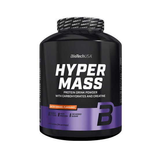 BioTech Hyper Mass - 2270g est une poudre à boire contenant des glucides, des protéines et de la créatine, riche en fibres et sans sucres ajoutés.