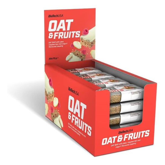 BioTech USA Oat&Fruit Bar Yogur Poire Framboise 20x70g est une barre d'avoine qui se distingue par sa haute teneur en fibres alimentaires et l'inclusion de véritables morceaux de fruits. Cette combinaison offre non seulement un en-cas délicieux, mais aussi nutritif.