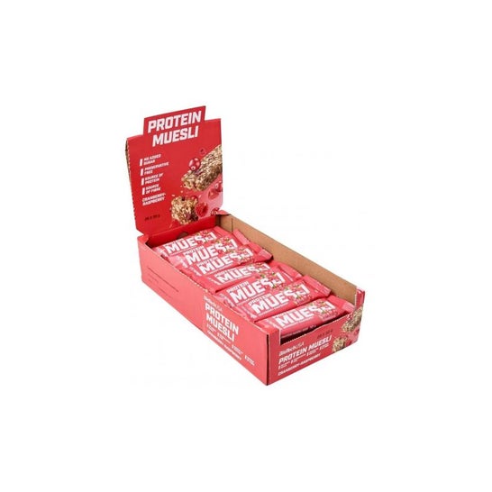 BioTech USA Protein Muesli Baies Rouges Framboise 28x30g est un snack sous forme de barre de muesli prêt à consommer, avec une teneur élevée en protéines, vitamines, minéraux et édulcorant.