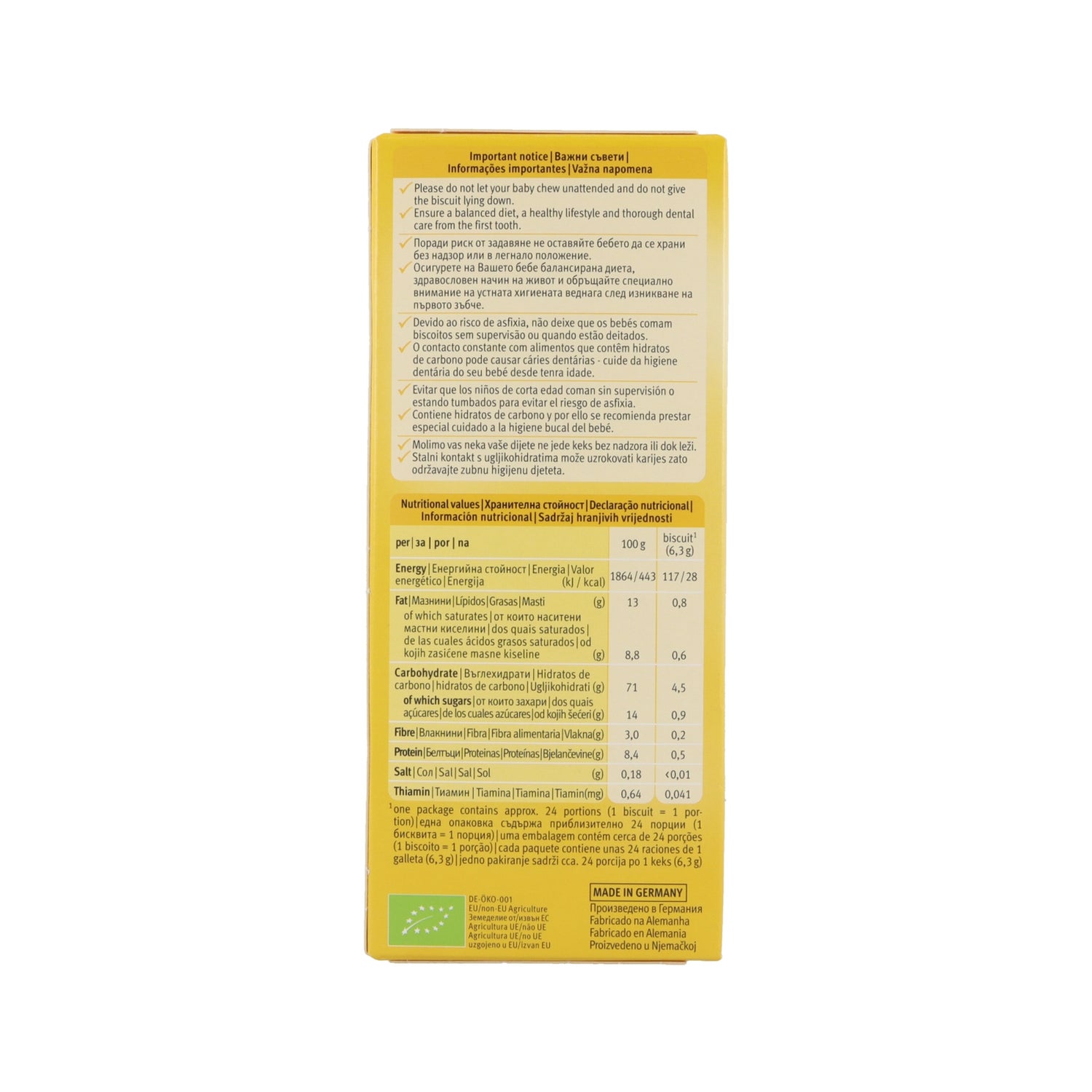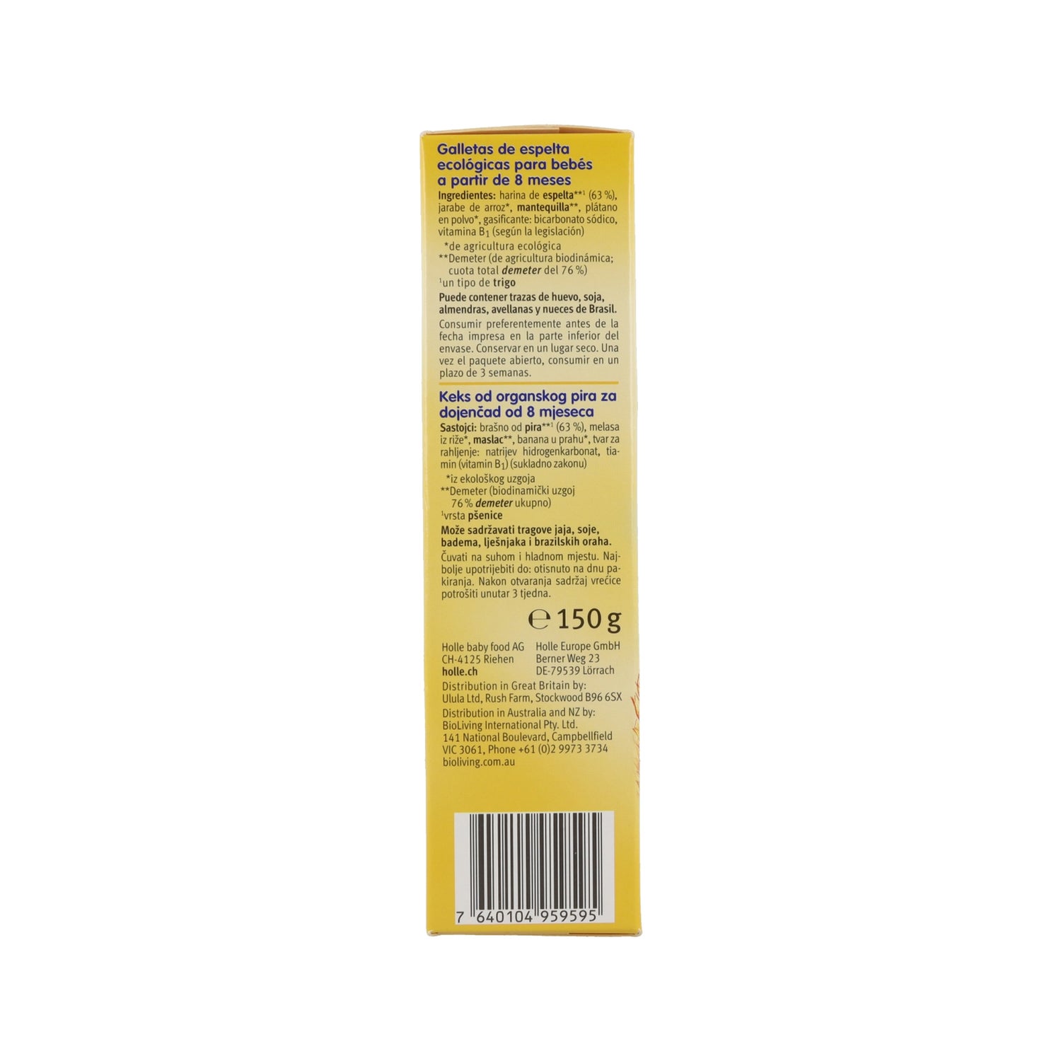Biscuits pour bébés fabriqués à partir de farine d'épeautre complète et 100% biologique. Recommandé pour contribuer à l'alimentation complémentaire dès l'âge de 8 mois. Ils contiennent de la banane, du beurre, de l'amidon de riz et du bicarbonate de sodium. Ils sont faciles à digérer et contribuent au bon développement des petits. Enrichi en vitamine B1 qui contribue au bon développement du système nerveux central. Il s'agit d'un produit certifié biologique.