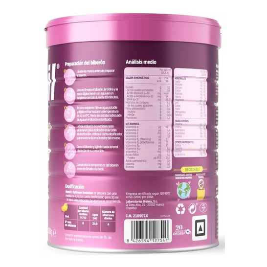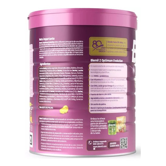 Blemil® 2 Optimum Evolution 800g est un lait de suite avec protéine a2, facile à digérer et avec les dernières avancées scientifiques. Il contient un mélange exclusif de 6 probiotiques et 5 HMO, oligosaccharides présents dans le lait maternel. De plus, il inclut des protéines bioactives comme l'ostéopontine lactée, mfgm et alpha-lactalbumine. Il apporte également dha, fer et calcium, étant une excellente option pour l'allaitement mixte et la transition au biberon. Cette formule est recommandée pour les nourrissons à partir de 6 mois, dans le cadre d'une alimentation diversifiée. Il est important de rappeler que le lait maternel est le meilleur aliment pour le nourrisson pendant les premiers mois de vie.