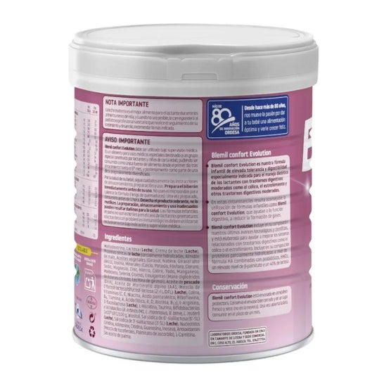 Blemil Confort Evolution 800gr est inclus parmi les laits spéciaux en raison de sa formulation spéciale, conçue pour éviter les coliques des nourrissons dès la naissance.