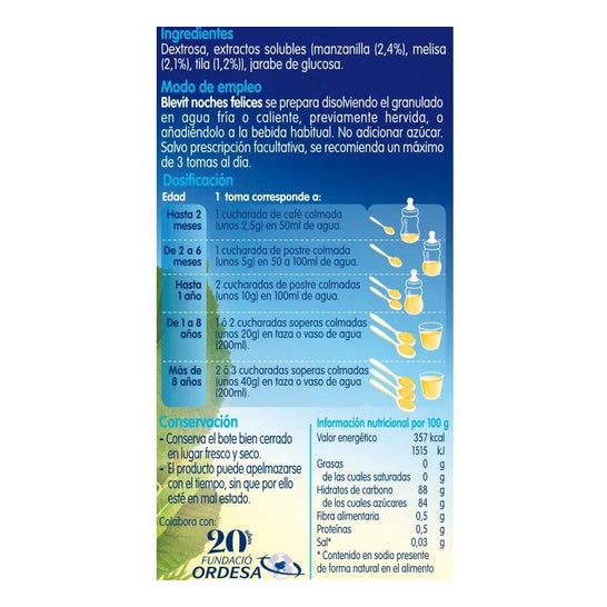 Dissoudre les granulés Blevit Sleep dans de l'eau froide ou chaude, ou également dans d'autres boissons habituellement consommées par l'enfant (jus de fruits, lait de vache, lait pour nourrissons, etc.). Cette infusion digestive peut être bue quotidiennement, de 1 à 3 fois par jour.