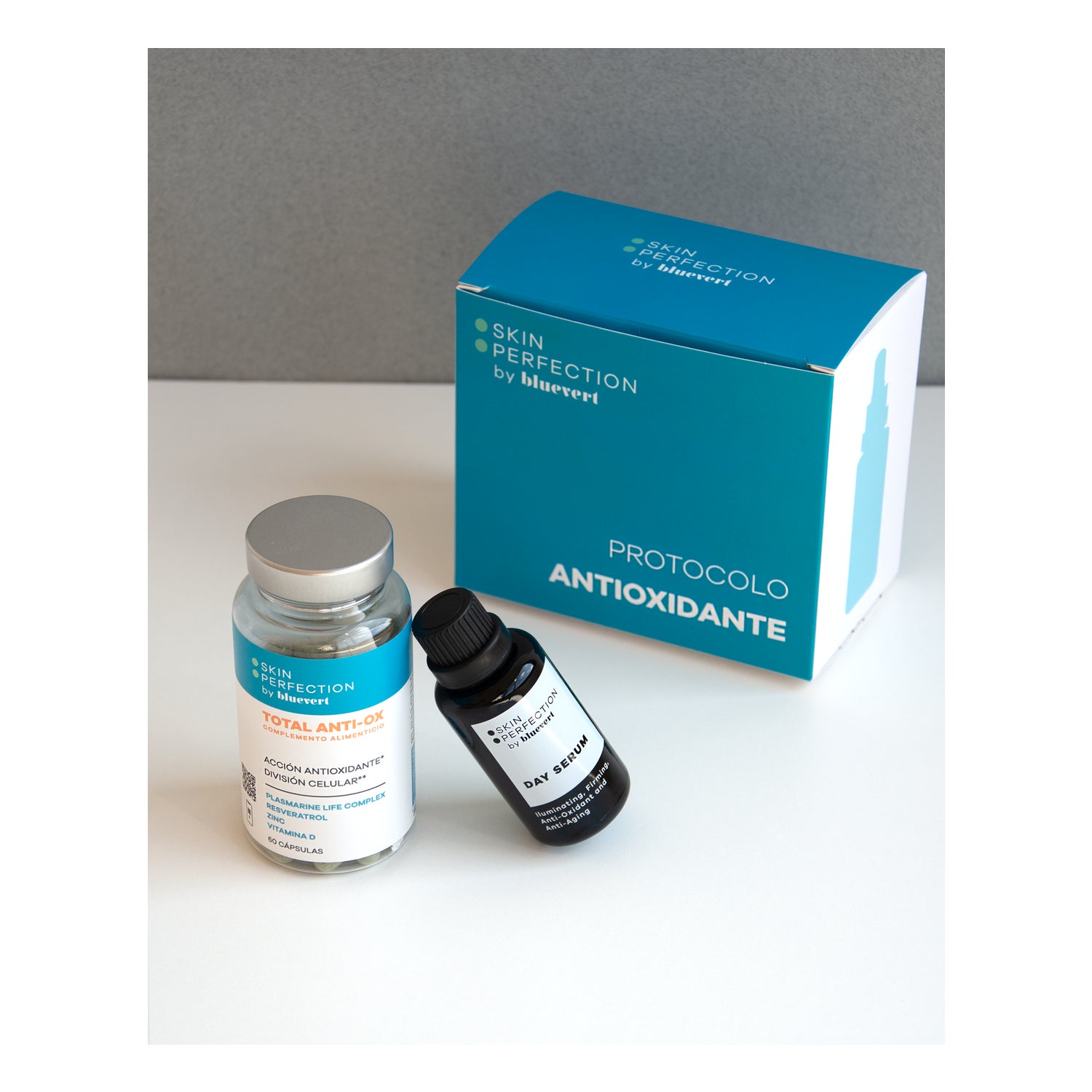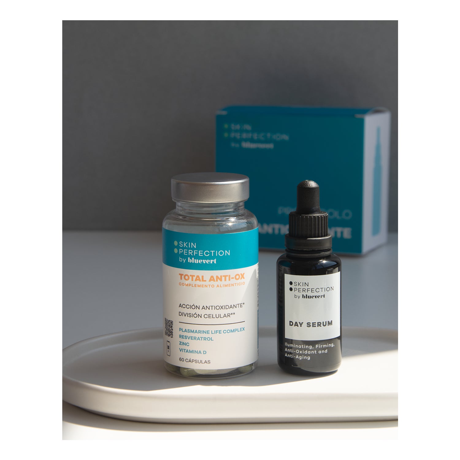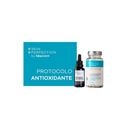 Bluevert Skin Perfection Pack Protocole Antioxydant est un coffret de soin du visage anti-âge associant un sérum à haute puissance antioxydante et un complément alimentaire exclusif, conçu pour protéger et revitaliser les cellules de l’intérieur.