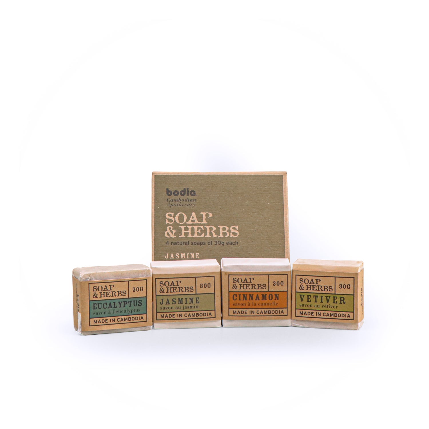 Eucalyptus : Huile de fruit d'Olea Europaea (Olive), Huile de Cocos Nucifera (Noix de coco), Eau, Hydroxyde de sodium, Huile de soja (Soya) Glycine, Huile de feuilles d'Eucalyptus Globulus, Extrait de feuilles de Moringa Oleifera.