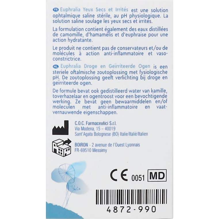 Boiron Euphralia Gouttes Oculaires Oeil Sec 10 ml est une solution lubrifiante indiquée pour la sécheresse oculaire légère provoquée par des facteurs environnementaux, tels que :