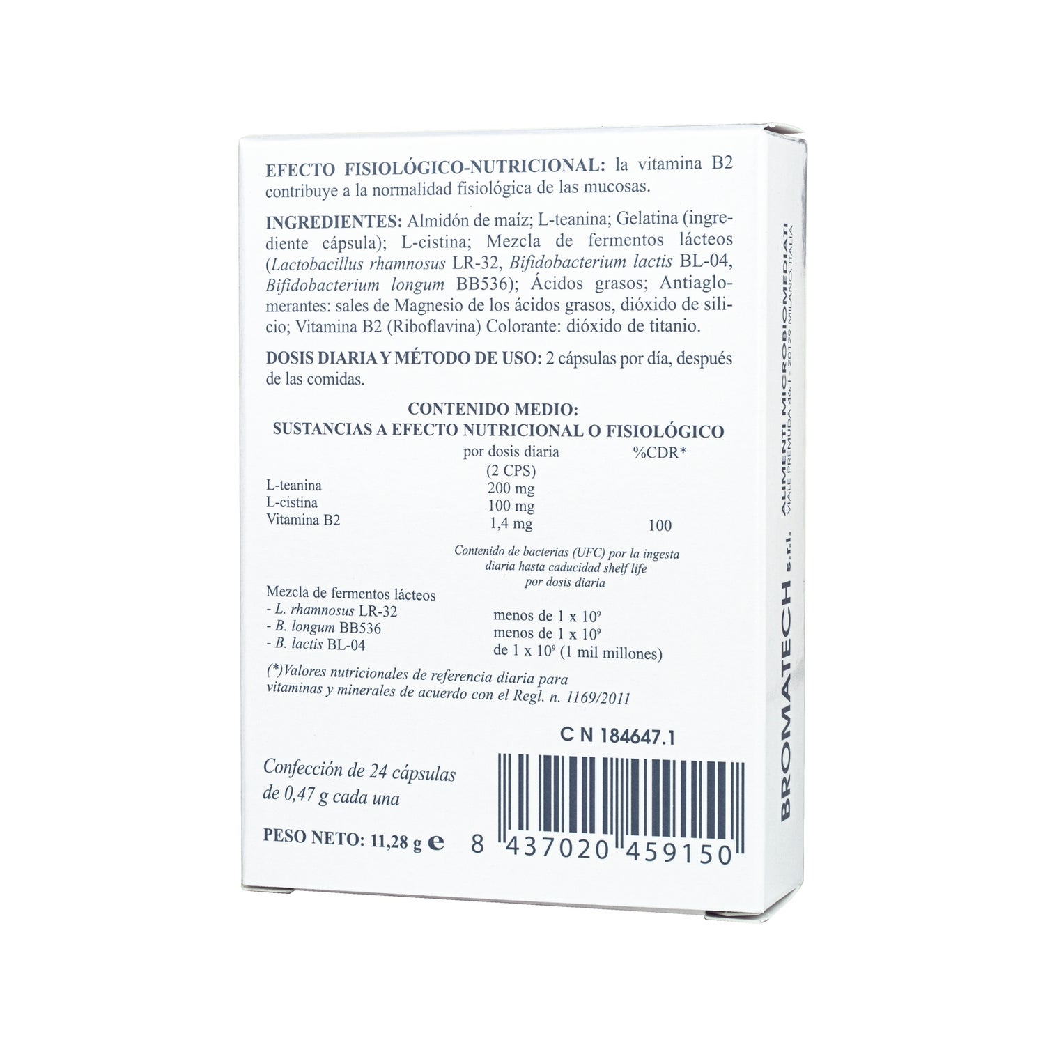 Complément alimentaire sous forme de capsule, à base de L-théanine, de L-cystéine, de vitamine B2 et de ferments lactiques, qui contribuent à protéger l'intégrité de la barrière intestinale. Aide à contrôler la fuite des cytokines indésirables vers des organes tels que le cerveau, le tissu adipeux et le système cardiovasculaire.