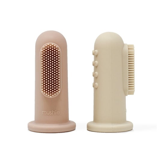 Dé à dents avec brosse à dents pour nettoyer les dents et le palais de bébé. La zone en pointillé est spécialement conçue pour masser et apaiser les gencives, ce qui contribue à rendre l'apparition des premières dents moins douloureuse.