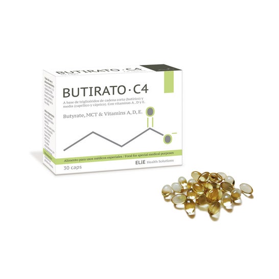Elie Health Solution est un supplément de Butyrate C4. Convient à un usage médical. Fabriqué à partir de triglycérides avec des vitamines A, D et E. Il est conçu pour l'utilisation diététique des altérations au niveau de l'intestin. Réduit l'inflammation locale dans l'intestin. Convient aux cœliaques. Ne contient pas de gluten ni de lait. Sans lactose ni sucre. Ne contient pas de soja. Assure le bien-être et favorise la santé.