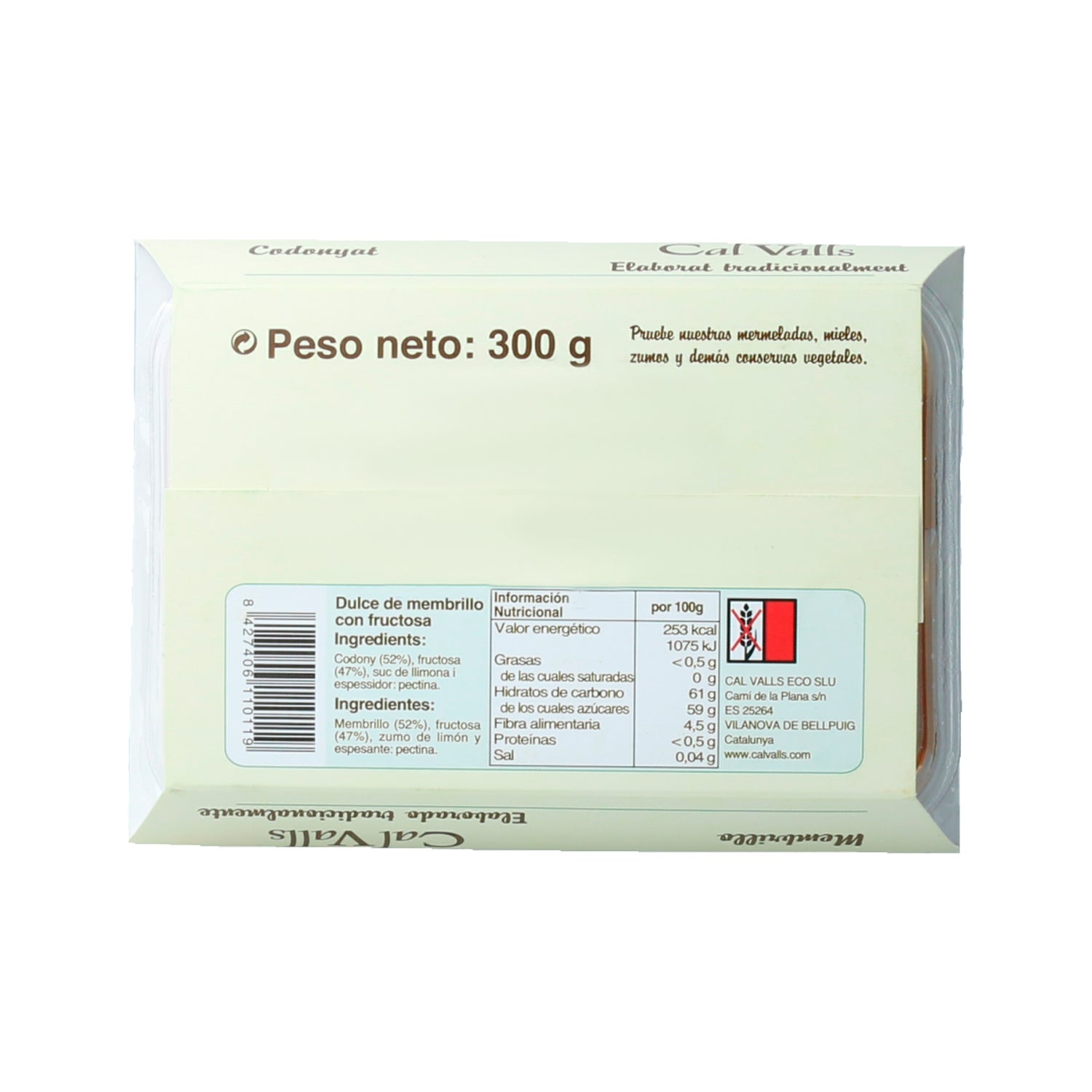 Confiture de coings sans sucres ajoutés. Contient du coing, du jus de citron, du fructose et de la pectine. Fabriqué en Catalogne avec des ingrédients issus de l'agriculture biologique. Le coing est un fruit qui contient des fibres et des tanins, il a un effet astringent et est riche en pectine, ce qui permet d'abaisser le taux de cholestérol sanguin élevé. Prêt à consommer.