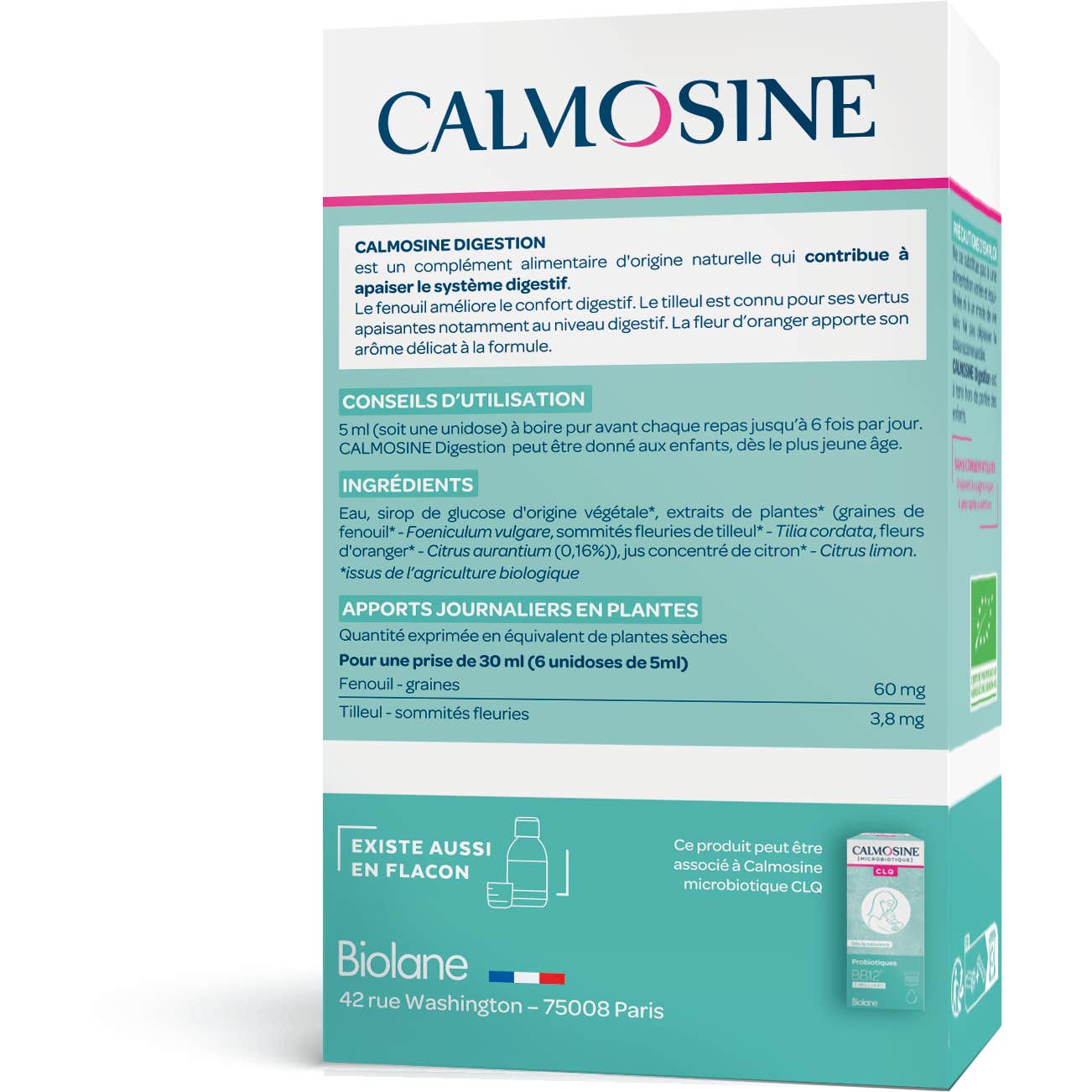 Nous avons rigoureusement sélectionné et dosé 3 plantes biologiques pour formuler Calmosine Digestion. Apaise les pleurs en agissant sur les ballonnements et les gaz : Fenouil (sans estragol) Contribue à réduire l’agitation du bébé et apporte une sensation de détente : Tilleul Améliore la saveur de Calmosine Digestion facilitant sa prise : Fleur d’oranger