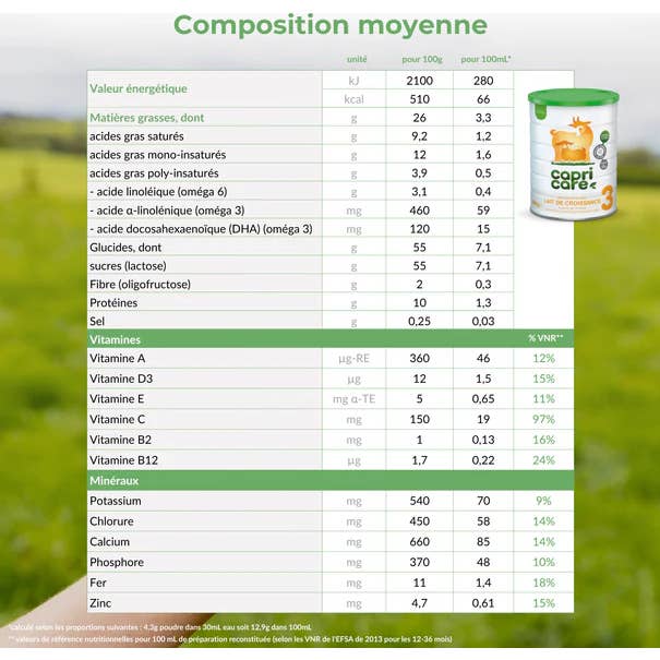Capricare® 3 Préparation pour Nourrissons 800g est un lait en poudre élaboré à partir de lait de chèvre.