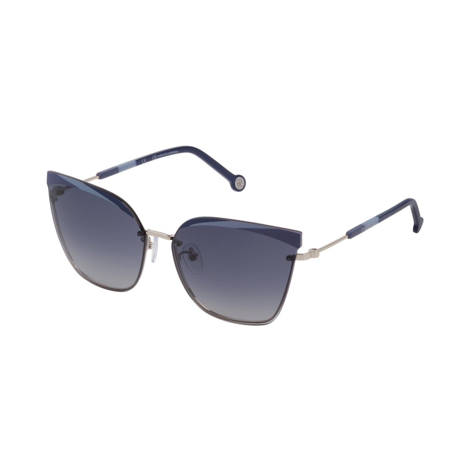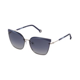 Lunettes de soleil pour femmes au design classique avec une forme carrée en œil de chat. Le cadre en métal argenté présente une partie supérieure tricolore dont les extrémités sont clairement marquées en bleu. Les branches sont fines et métalliques et les extrémités sont gainées d'un matériau thermoplastique tricolore, identique à celui du haut de la monture, avec une sérigraphie discrète de la marque et des extrémités arrondies avec le logo de la marque imprimé à l'intérieur. Les verres de qualité supérieure sont bleu fumé avec dégradé et ont un diamètre de 64 mm.