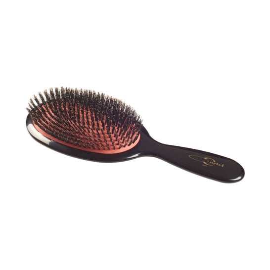 Broche de cheveux conçu avec des filaments en nylon/poils de sanglier, flexibles et moyens. Ils permettent de ne pas abîmer les cheveux et peuvent être utilisés sur des cheveux humides ou secs, ou pour appliquer des produits lors de traitements capillaires.
