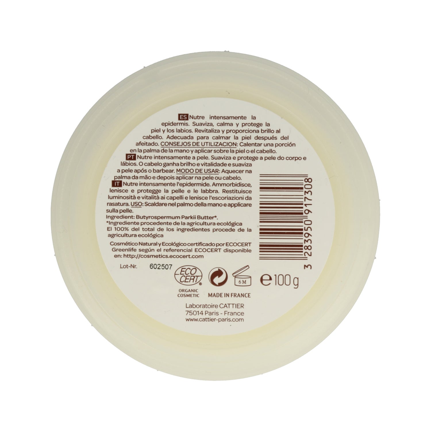 Beurre de karité issu d'une production 100% biologique certifiée, riche en vitamines A, D, E et F, particulièrement adapté pour nourrir en profondeur l'épiderme du visage et du corps. Il peut également être utilisé pour donner de la brillance aux cheveux.