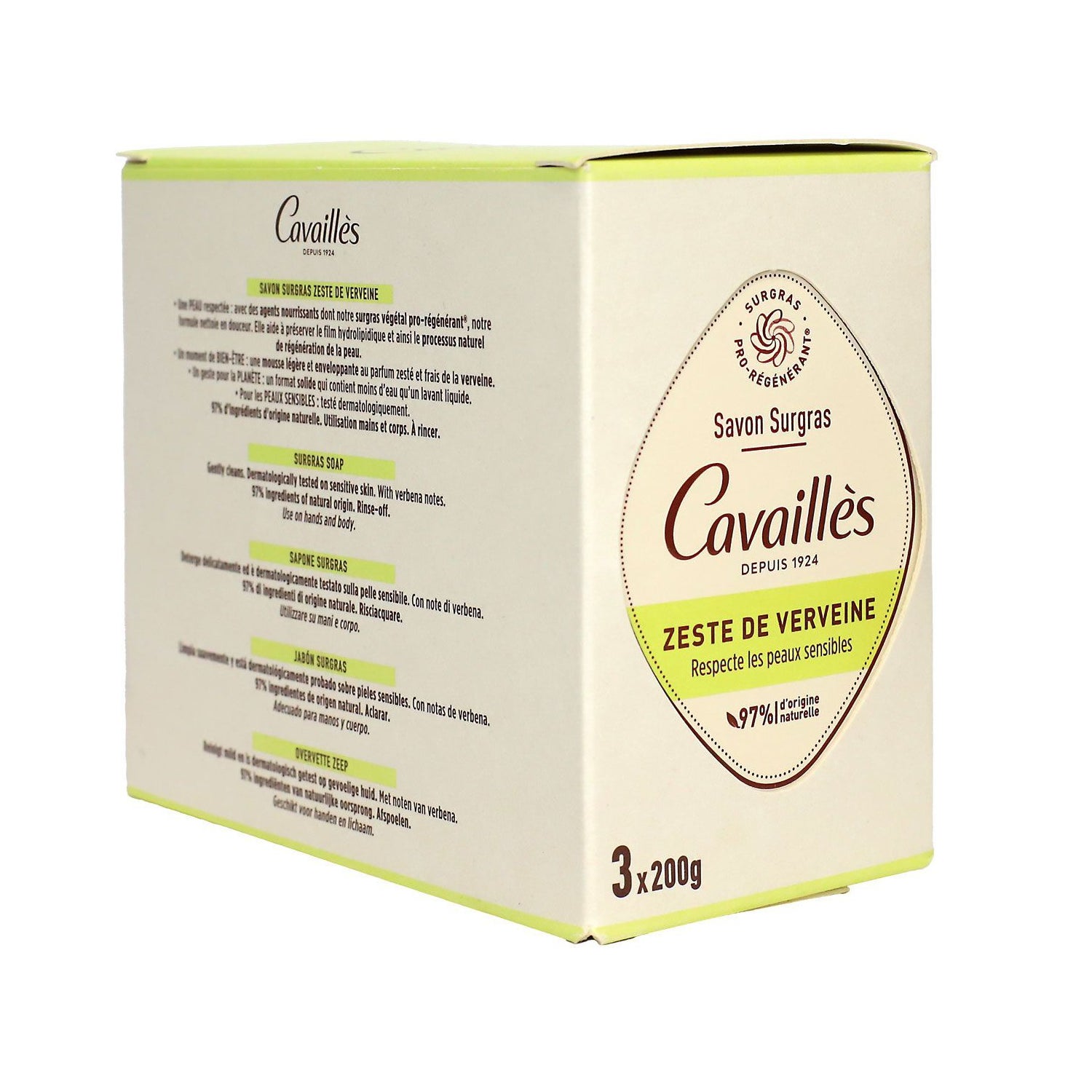 Cavaillès Savon Surgras Zeste de Verveine est composé de 97% d'ingrédients d'origine naturelle, ce qui renforce son engagement envers la santé de la peau et le respect de l'environnement.