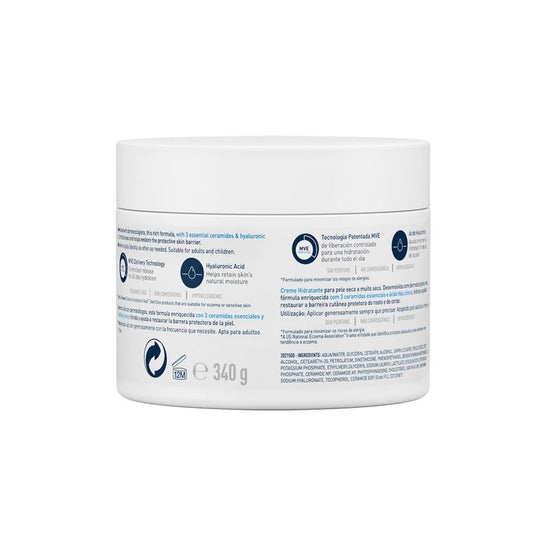 CeraVe Crème Hydratante 340g est une crème hydratante conçue pour hydrater la peau sèche en profondeur et réparer la barrière protectrice de la peau du visage et du corps.