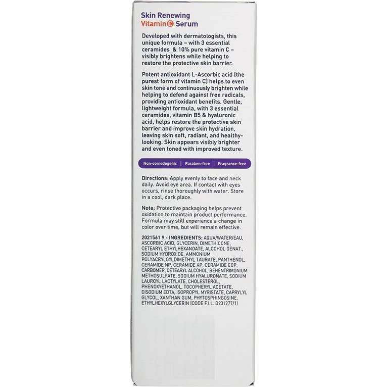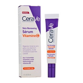 Sérum Vitamine C CeraVe Skin Renewing est un produit développé en collaboration avec des dermatologues, conçu pour traiter les premiers signes de l'âge. Ce sérum contient 10 % de vitamine C pure, un puissant antioxydant, ainsi que trois céramides essentielles similaires à celles présentes dans la peau et une technologie MVE qui assure une libération prolongée de ses actifs.