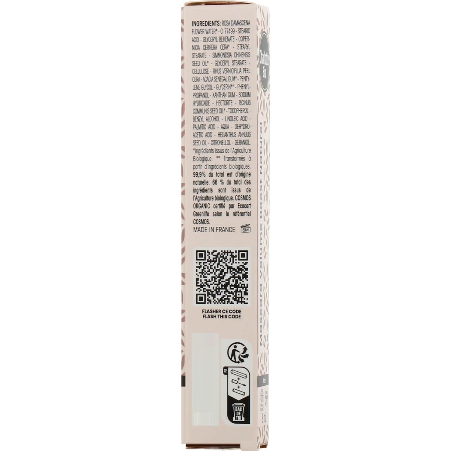 Charlotte Bio Mascara Volume Boost Naturel Black 8ml est un produit qui se distingue par sa formule écologique et naturelle, composée à 99,99% d'ingrédients d'origine naturelle, dont 66% proviennent de l'agriculture biologique. Ce mascara est certifié végane et possède des accréditations de Cosmebio et Ecocert, ce qui garantit son engagement envers l'environnement et sa fabrication sans tests sur les animaux, conformément à la réglementation européenne.
