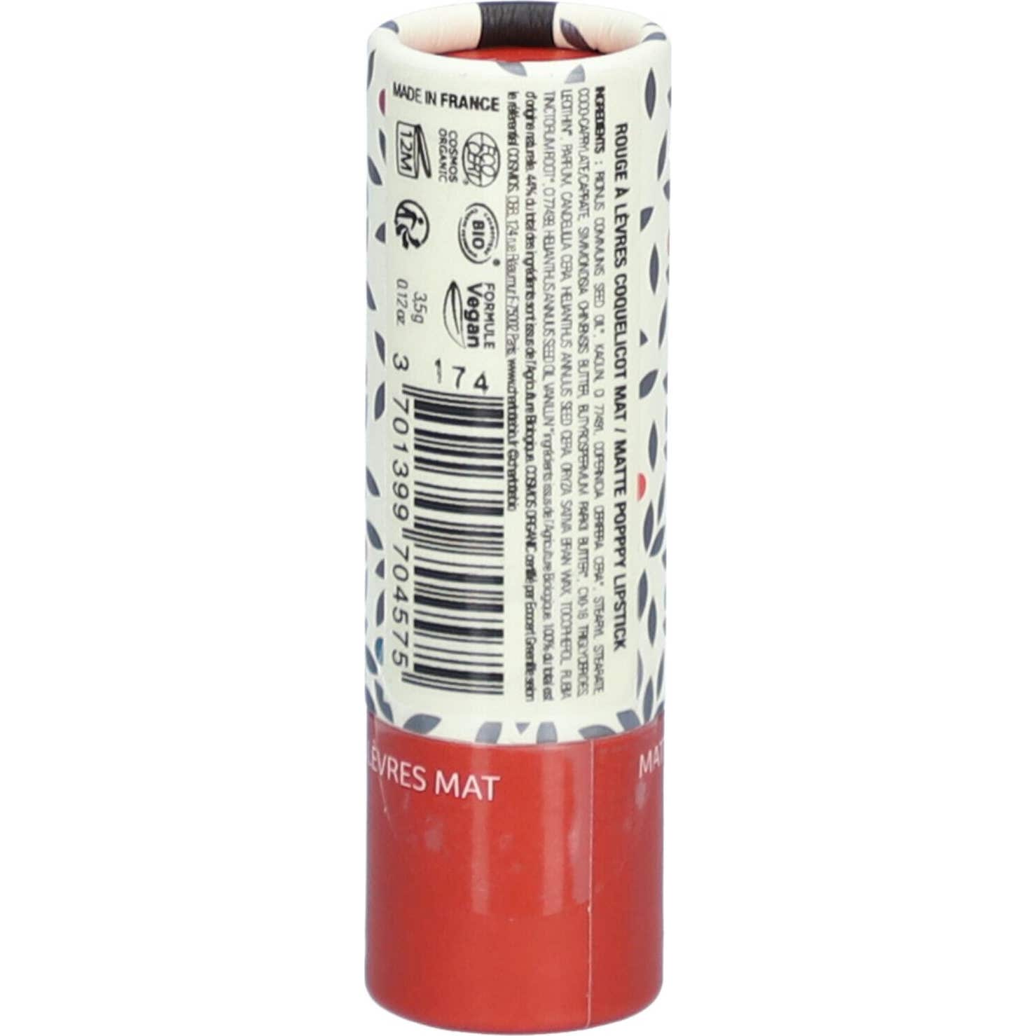 La finition mate de ce rouge à lèvres est élégante et durable, maintenant la couleur intense sans assécher les lèvres. Sa formule organique est enrichie en cires végétales et principes actifs qui apportent nutrition et confort. Parmi ses ingrédients, on trouve :