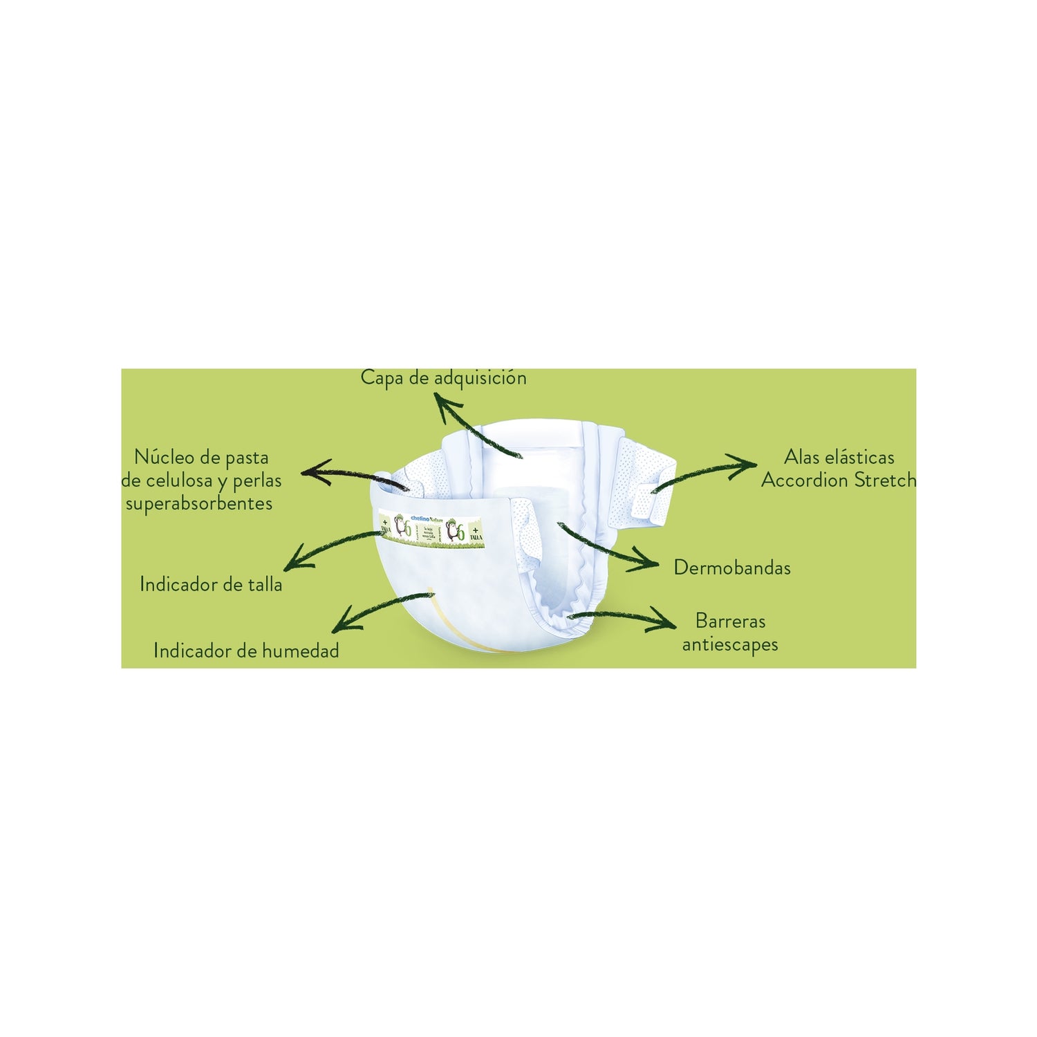 Couches respectueuses du bébé et de l’environnement. Avec un noyau super-absorbant qui aide la peau du bébé à rester sèche pendant au moins 12 heures. Conçues pour s’adapter au corps du bébé et avec des produits naturels pour éviter de possibles allergies.