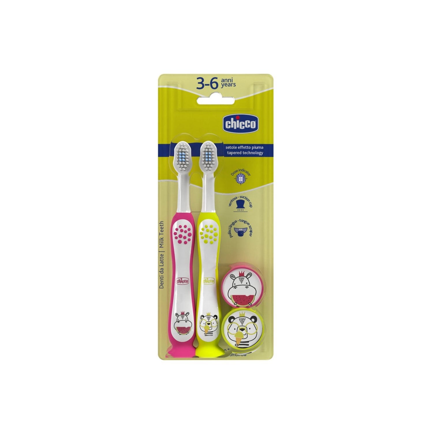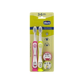 Chicco Brosse à Dents Rose Jaune 3-6 Ans 2uds est un ensemble de deux brosses à dents conçues pour nettoyer les premières dents de lait des bébés et des enfants de 3 à 36 mois.