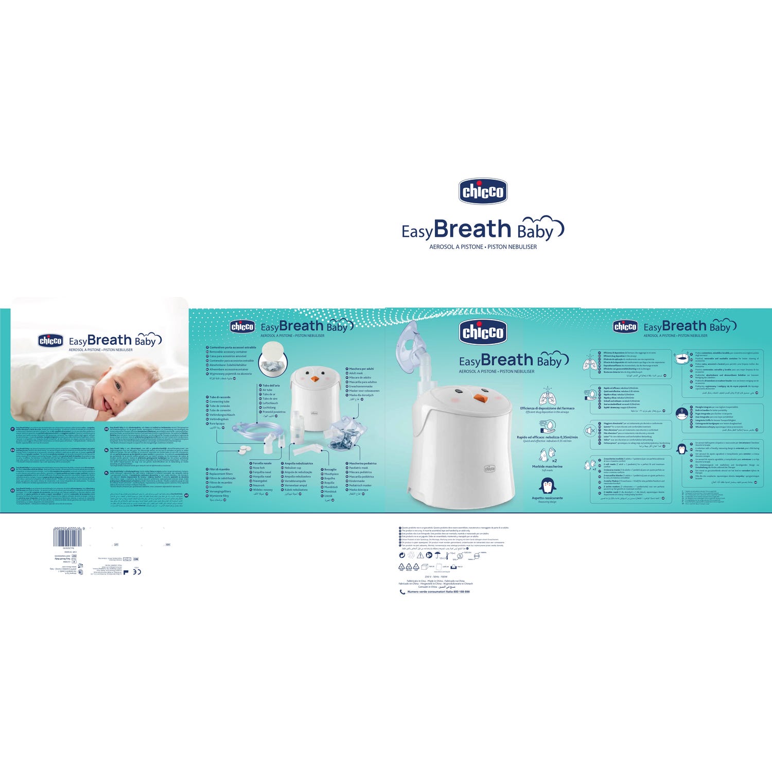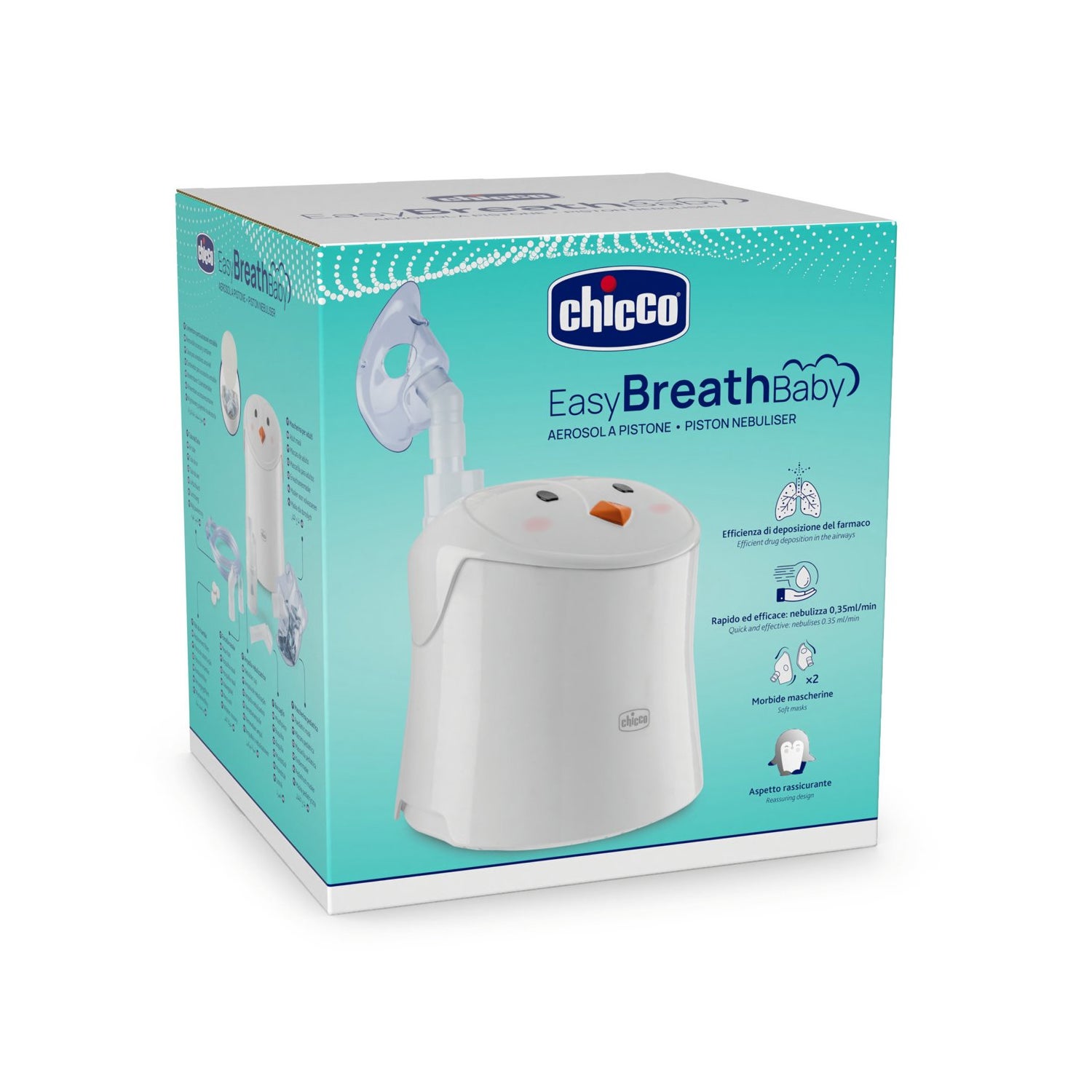 Nébuleuse Chicco Easy Breath Baby est un nébuliseur à compresseur à piston, conçu pour être compact, silencieux et facile à utiliser. Son couvercle présente un design attrayant imitant le visage d'un animal amical, créant une ambiance moins intimidante pour les enfants pendant le traitement.