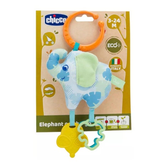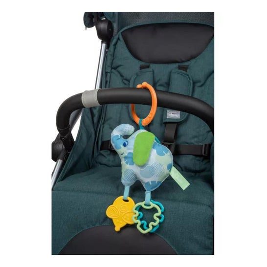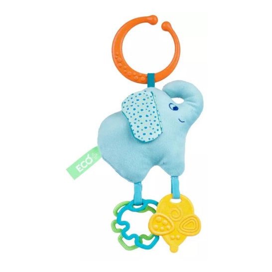 Hochet en forme d'éléphant qui aide à détendre les petits au moment du coucher ou lors des trajets en voiture. Contient un anneau qui permet de l'attacher facilement aux berceaux ou aux poussettes.