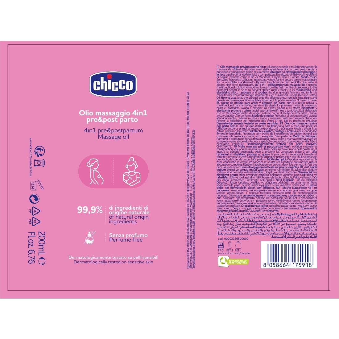 Chicco Huile de Massage Pré et Postnatal 4 en 1 200ml est une option naturelle et polyvalente, conçue pour une utilisation depuis les premiers mois de grossesse jusqu'à la période postnatale. Cette huile se présente comme une solution intégrale qui contribue à la prévention des vergetures.