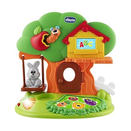 Le jeu éducatif bilingue Chicco la Maison du Lapin présente le personnage d'un petit lapin qui aide les enfants à apprendre les noms des légumes, les couleurs, les lettres et la chanson ABC dans deux langues différentes.