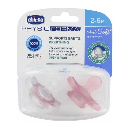 Sucette fabriquée en silicone hygiénique et sans bouclier rigide. Elle a un design petit et léger qui s'ajuste au visage du bébé pour laisser le nez et le menton libres, pour plus de confort.