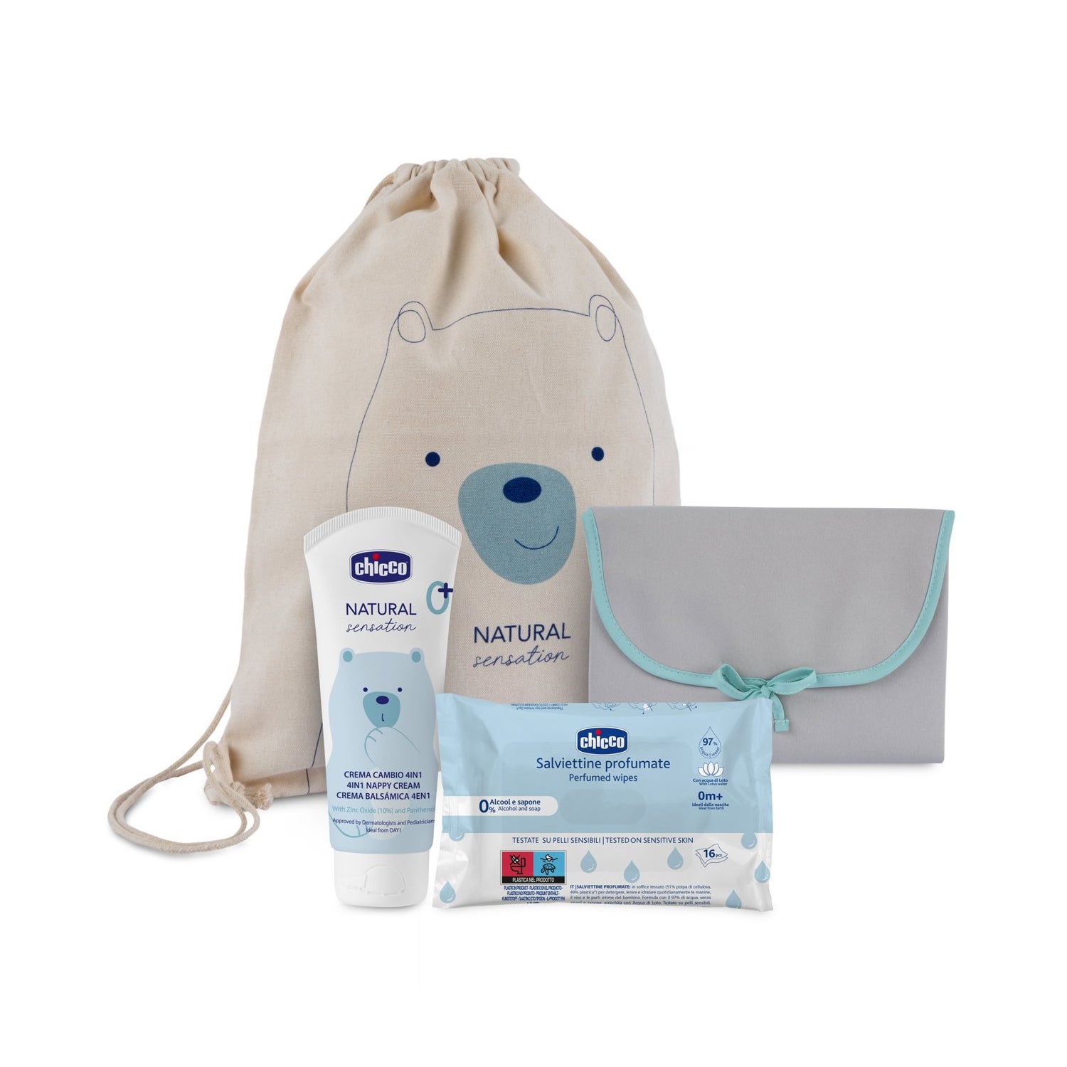 Chicco Natural Sensation Set de Change de Couches 4 unités pour la protection et le soin de la peau du bébé est un set d'hygiène quotidienne dès le premier jour. Il comprend gel nettoyant, crème protectrice et lingettes, dans un format pratique de 4 unités, avec des formules naturelles et douces pour les peaux sensibles des nouveau-nés. Les produits sont dermatologiquement testés.