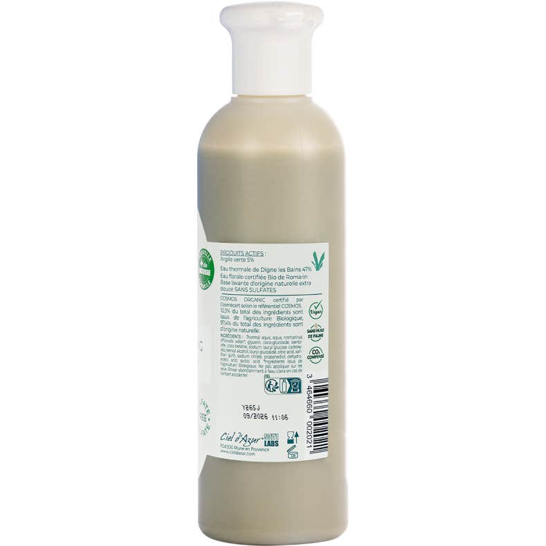Ce shampooing utilise de l'argile pour maintenir l'équilibre du pH du cuir chevelu, ce qui aide à prévenir des problèmes tels que les pellicules. De plus, il régule la production de sébum, évitant que les cheveux ne soient excessivement secs ou gras. L'inclusion d'eau thermale de Digne-les-Bains, connue pour ses propriétés antalgiques et anti-infectieuses, apporte un soin supplémentaire à la chevelure.