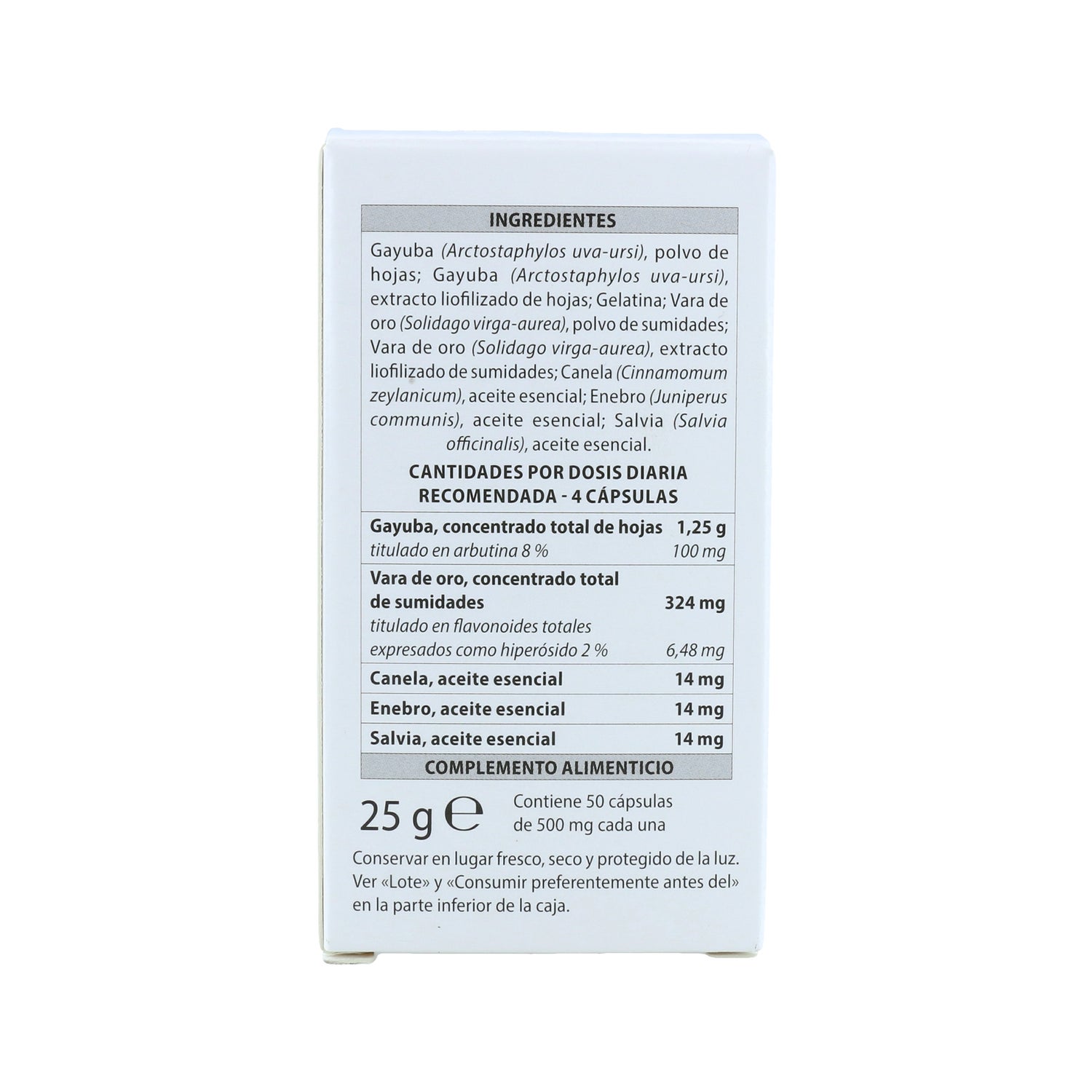 CONCENTRÉ TOTAL DE FEUILLES DE BOUSSEROLE 1,25 G, HUILE ESSENTIELLE DE GENÉVRIER 14 MG, CONCENTRÉ DE FLEURS DE VERGE D'OR 324 MG, HUILE ESSENTIELLE DE CANELLE 14 MG TITRÉE EN FLAVONOÏDES COMME LA QUERCÉTINE 3,8% 12,3 MG, HUILE ESSENTIELLE DE SAUGE 14 MG TITRÉE EN ARBUTINE 8% 100 MG.