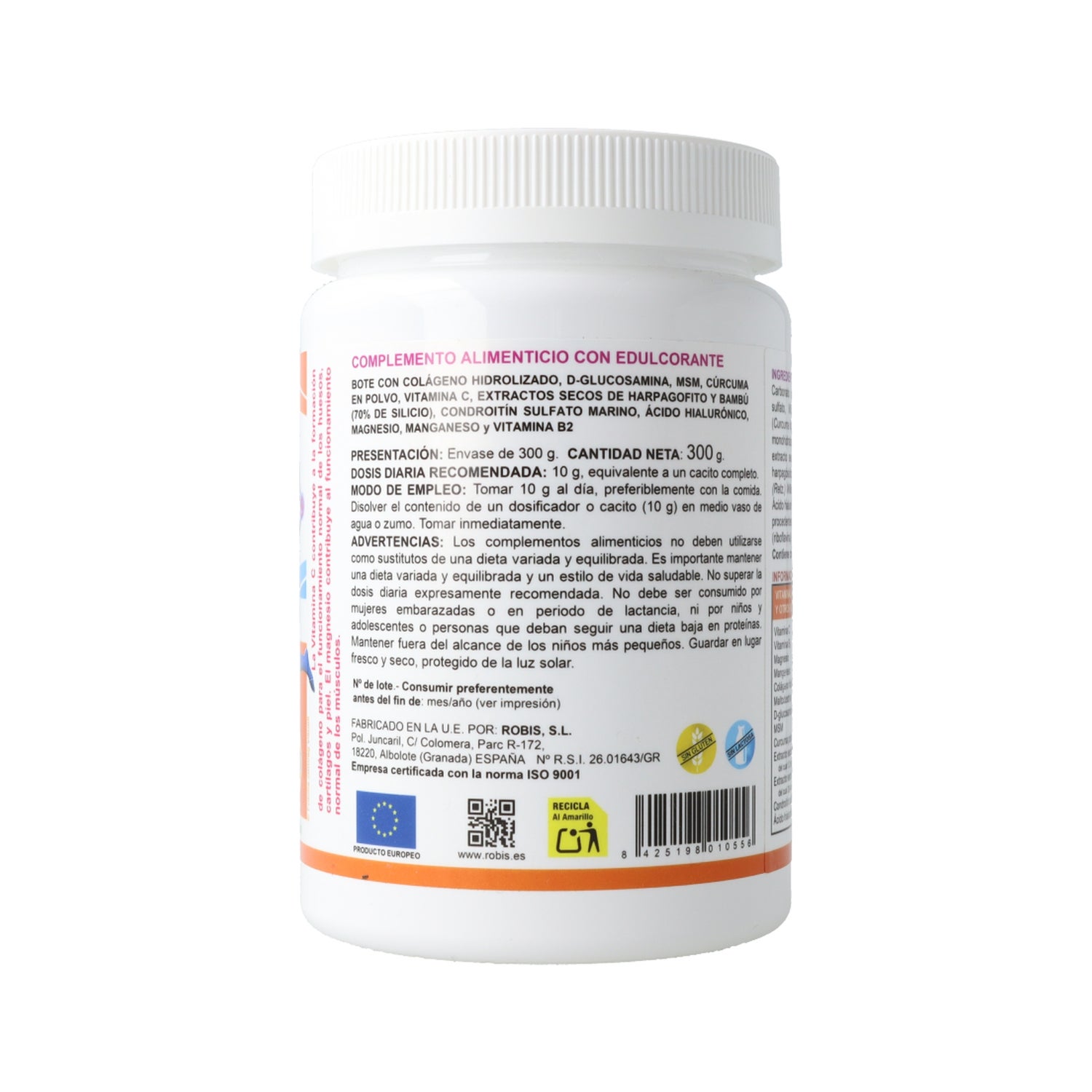 Complément alimentaire à base de collagène, l'une des protéines les plus essentielles pour le corps humain puisqu'elle est l'ingrédient principal pour maintenir en bon état les articulations, les cheveux et la peau. Le collagène hydrolysé a un plus grand pouvoir d'absorption par l'organisme qui l'assimile plus efficacement.