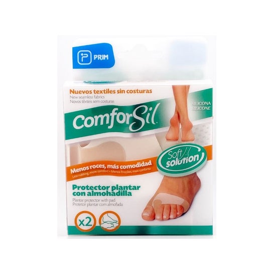 Comforsil Protecteur Plantaire avec Coussin CC256 TL, en présentation de deux unités, est un protecteur conçu pour offrir confort et soutien aux pieds. Ce produit est confectionné en un tissu élastique et doux, qui ne comporte pas de coutures, minimisant ainsi la possibilité de frictions pendant son utilisation.