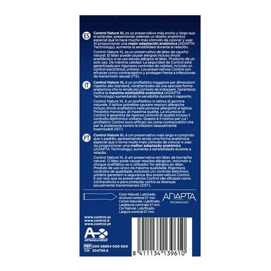 La taille XL vous permet de profiter pleinement du plaisir des rapports sexuels. Ces préservatifs sont lubrifiés et sont idéaux pour une nuit de sensations et d'expériences. Vous augmenterez votre plaisir grâce à la protection confortable et adaptable du control adapts nature XL 12 pcs. préservatifs.