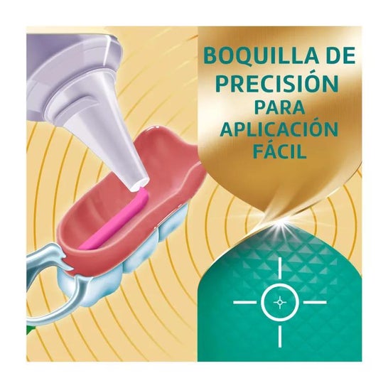 Pâtes pour réparer les prothèses dentaires ou les prothèses dentaires. Fournir une action jusqu'à 12 heures de fixation. Tenez-vous toute la journée en place et s'adapte à tout type de prothèse: supérieur, inférieur ou partiel, le produit peut être appliqué dans les zones indiquées confortablement grâce à sa buse précise.