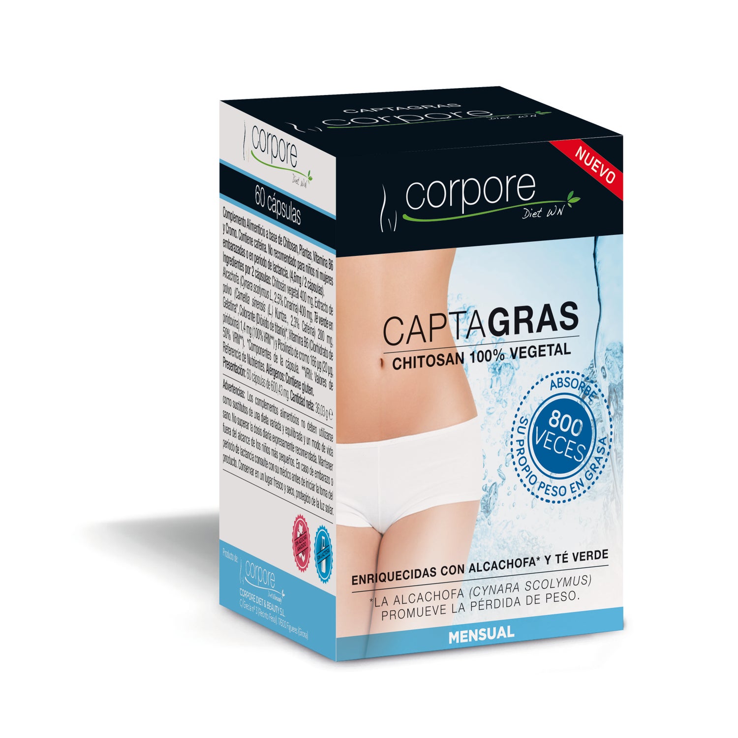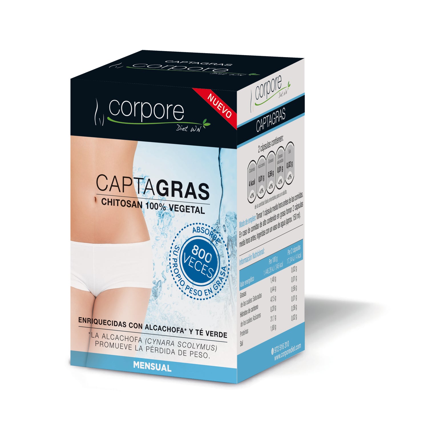 Les capsules de Captagras contiennent un composant 100% naturel, Chitosan, qui est indiqué pour les personnes qui suivent un régime et/ou des périodes de réduction de poids. Grâce à l'un de ses composants, l'Artichaut, contient des propriétés à perdre, car il a une action dépurative, diurétique et métabolique. De plus, il possède également des propriétés idéales pour brûler les graisses et réduire l'enflure en vous aidant à expulser les liquides retenus ;