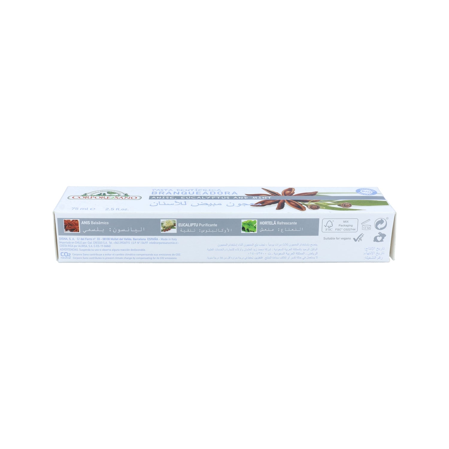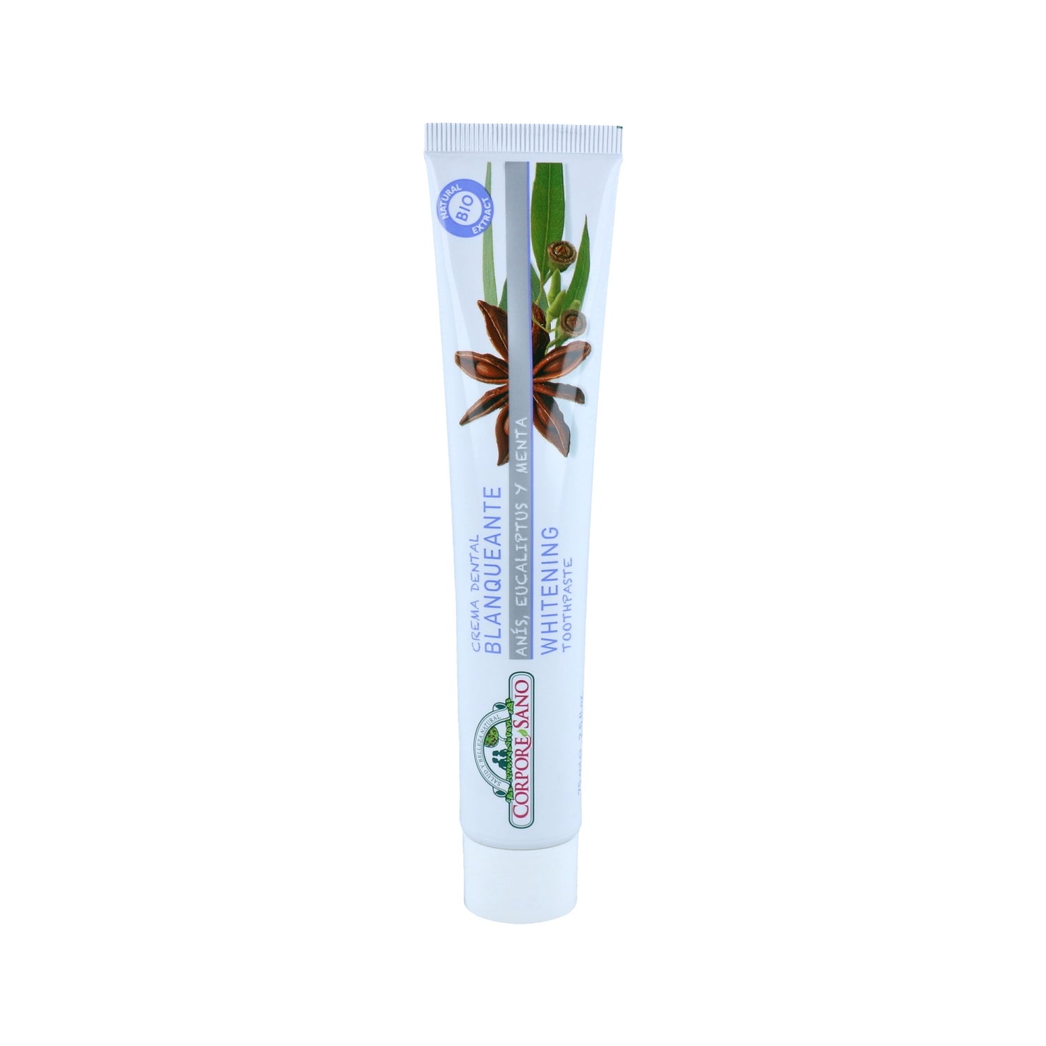 Gel dentifrice à action blanchissante à base de menthe, eucalyptus et anis. Aide à l'hygiène buccale quotidienne et procure une haleine fraîche. Convient aux utilisateurs d'appareils orthodontiques. Aide à éliminer les bactéries à l'origine de la mauvaise haleine. Aide à éliminer la plaque dentaire, protège contre les caries, aide à renforcer l'émail des dents et protège les gencives. Contient du fluor qui aide à reminéraliser les dents. Effet dents blanches dès la première utilisation.