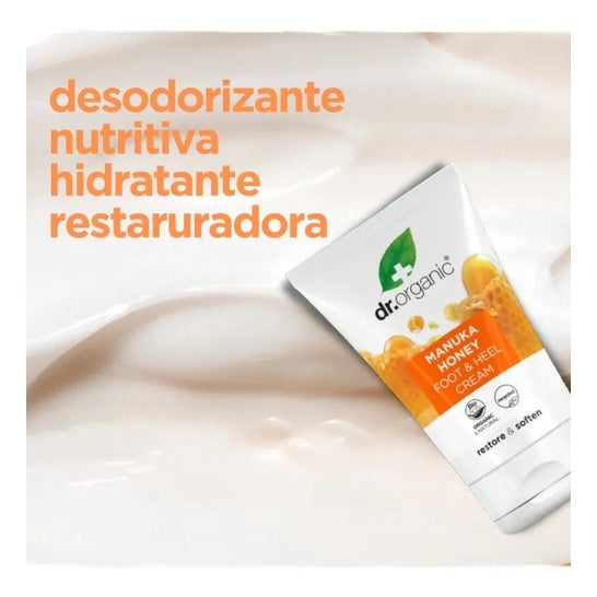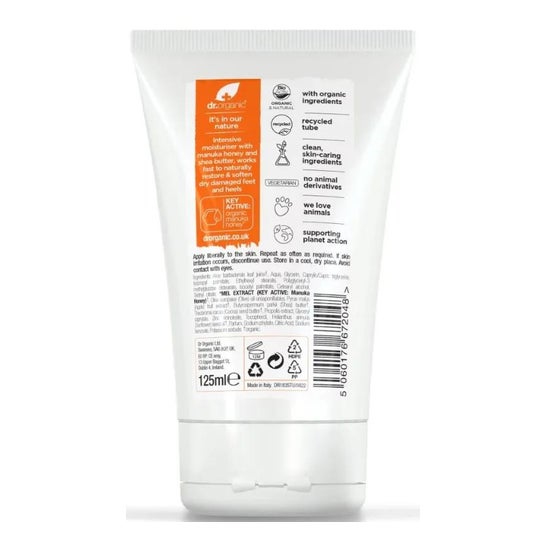 Dr Organic Manuka Honey Heel and Foot Cream 125ml est une crème riche en antioxydants contenant du miel de manuka, de l'aloe vera, de l'huile d'olive, de la propolis, de l'huile de tournesol et de la vitamine E. Elle hydrate et protège les pieds et les talons secs, fendillés et abîmés. Hydrate et protège les pieds et les talons secs, fissurés et abîmés. Accélère la régénération naturelle des cellules et améliore la tonicité de la peau.
