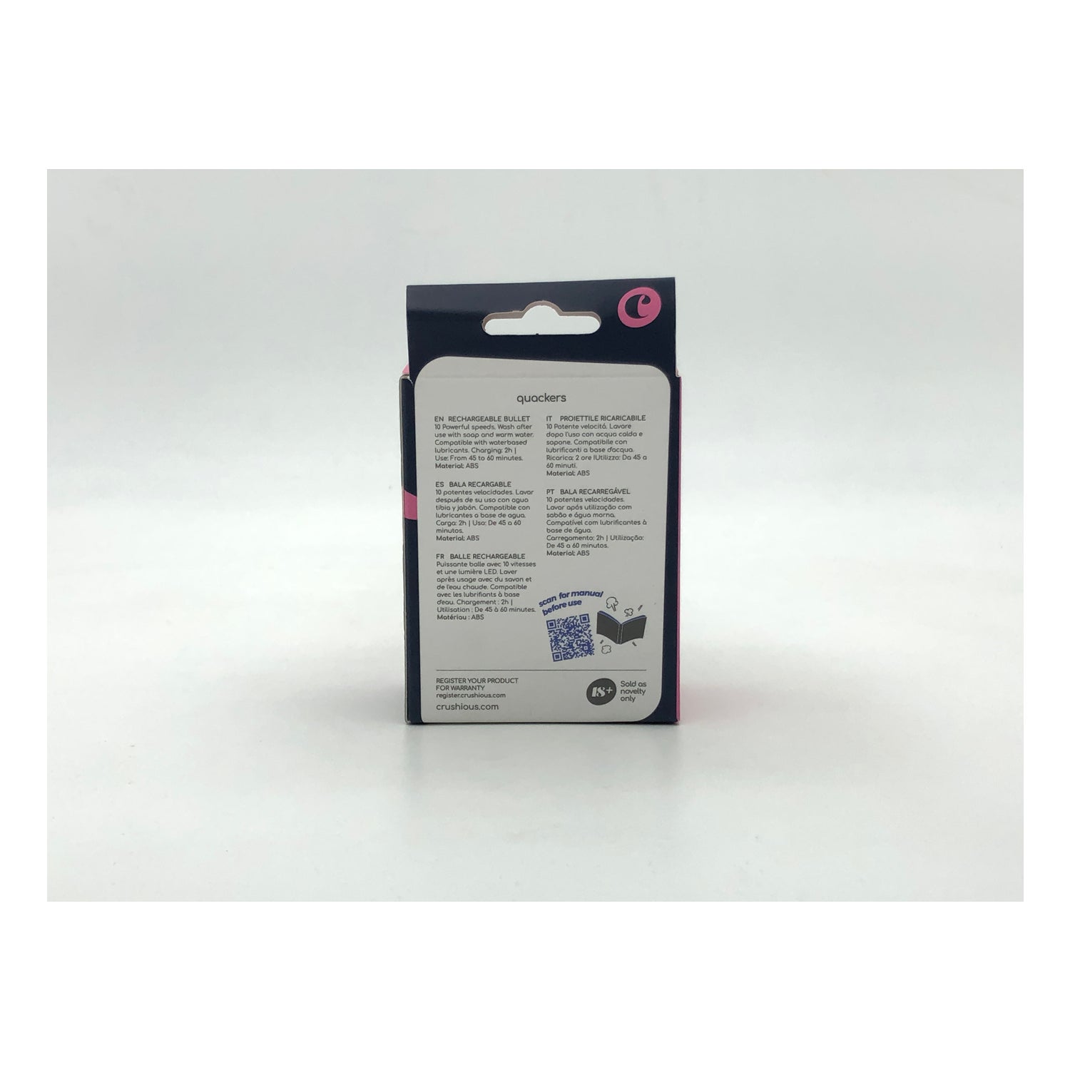 Crushious Quackers Pink Usb Rechargeable Vibrating Bullet 1pc est un vibrateur pour une utilisation en solo ou en couple, fabriqué en silicone sans phtalates et sans danger pour la peau, avec une batterie lithium-ion rechargeable. Conçu pour être aussi petit qu'un rouge à lèvres, il offre 10 modes de vibration différents. Il est rechargeable par USB et dispose d'une autonomie de 45 minutes à haute vitesse et de 60 minutes à basse vitesse, et il est étanche.Dimensions : 8,6 cm de longueur et 2,5 cm de diamètre.