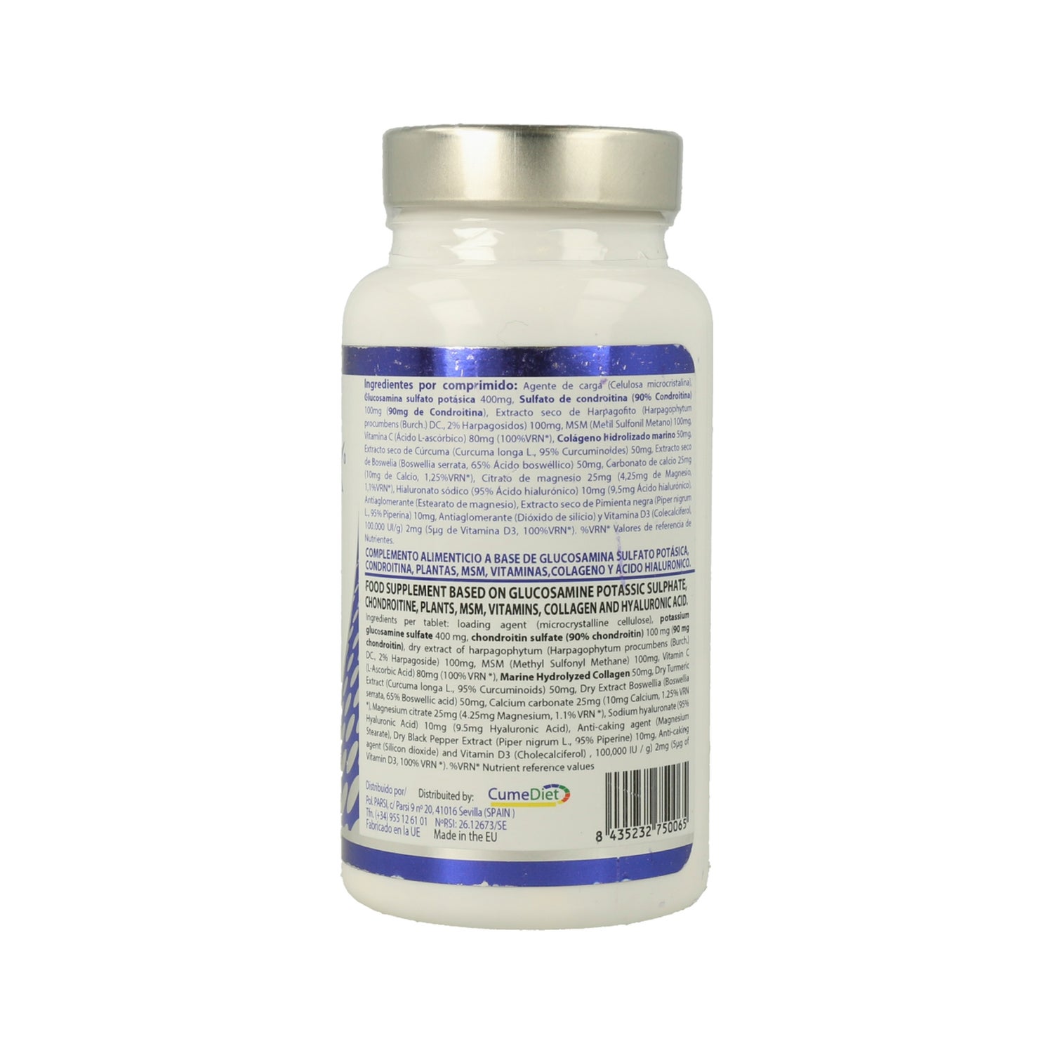 Agent de charge (Cellulose microcristalline), Glucosamine sulfate de potassium 400mg, Chondroïtine sulfate (90% Chondroïtine) 100m9 (90m9 de Chondroïtine), Extrait sec d'Harpagophytum (Harpagophytum procumbens (Burch.) DC.., 2% Harpagosides) 100mg, MSM (Methyl Sulfonyl Methane) 100mg, Vitamine C (Acide L-Ascorbique) 80mg (100% NRV*), Collagène marin hydrolysé 50mg, Extrait sec de Curcuma (Curcuma tonga L., 95% Curcuminoïdes) 50 mg, Extrait sec de Boswellia (Boswellia serrata, 65% acide boswellique) 50 mg, Carbonate de calcium 25mg (10mg Calcium, 1,25% VNR*), Citrate de magnésium 25mg (4,25mg Magnésium, 1,1%VRN*), Hyaluronate de sodium (95% Acide Hyaluronique) 10mg (9,5m9 Acide Hyaluronique), Anti-agglomérant (Stéarate de magnésium), Extrait sec de Poivre noir (Piper nigrum L., 95% Piperine) 10mg, Anti-agglomérant (dioxyde de silicium) et Vitamine D3 (Cholecalciferol, 100,000 IU/g) 2mg (5 mcg Vitamine D3, 100%VRN*).