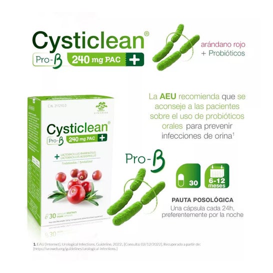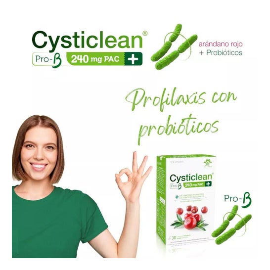 Cysticlean Pro-B 30caps est un complément alimentaire pour prendre soin du tractus urinaire. Élaboré à base d'extrait sec concentré de cranberry riche en proanthocyanidines (PAC) et D-mannose, plus des Lactobacillus rhamnosus et Lactobacillus acidophilus tindalisés qui aident à renforcer son action. Indiqué pour protéger le système urinaire.